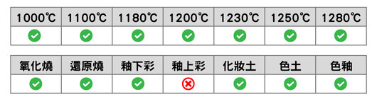 2.可用來調製成化妝土/泥、色釉、釉下彩、色土、釉下鉛筆…等。請注意要調合的原料有沒有鋅,鋅會改變色料發色,尤其是綠色改變最大,紅色則可能會不紅。