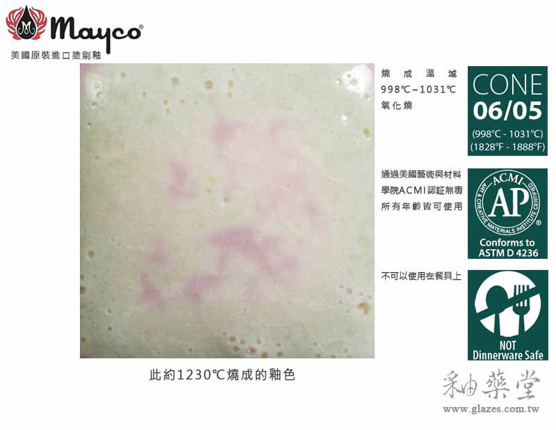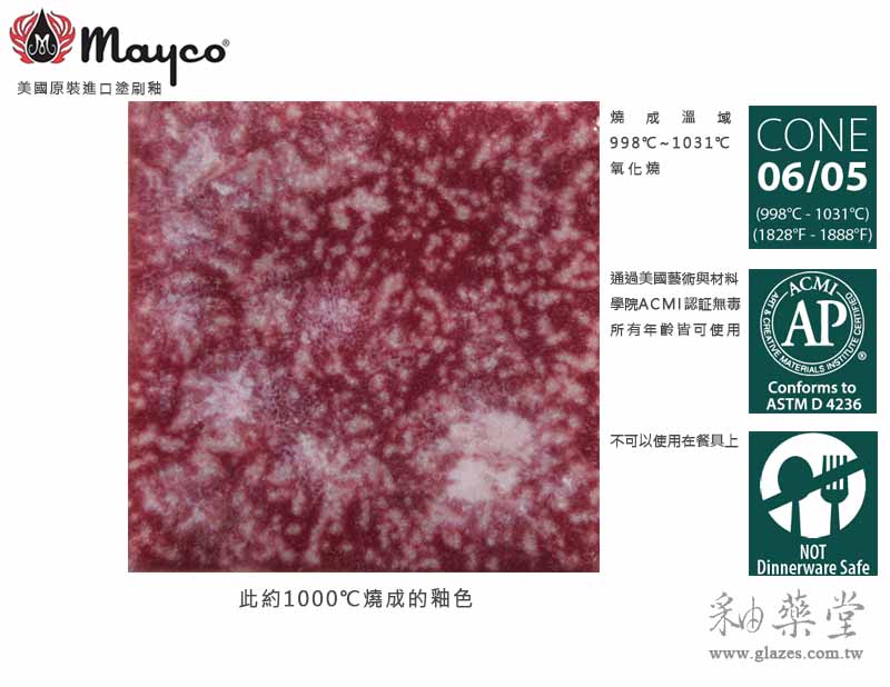 Mayco為美國專門釉藥大廠,釉藥燒成溫域廣且穩定,並通過美國藝術與材料學院ACMI認証。