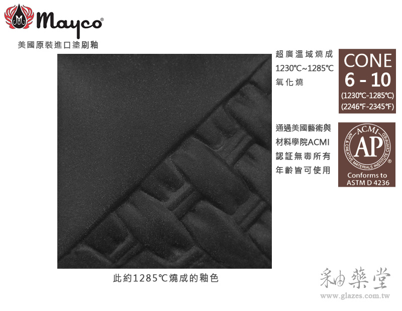 Mayco為美國專門釉藥大廠,釉藥燒成溫域廣且穩定,並通過美國藝術與材料學院ACMI認証。