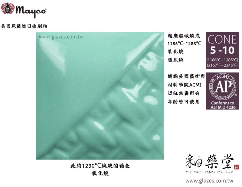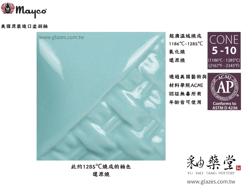 Mayco為美國專門釉藥大廠,釉藥燒成溫域廣且穩定,並通過美國藝術與材料學院ACMI認証。